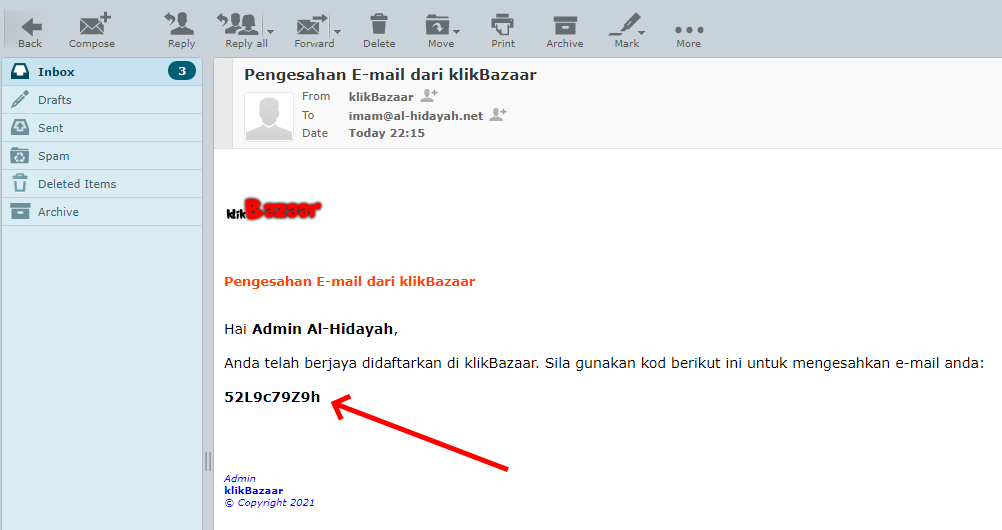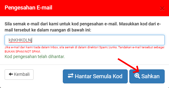 Email akan dihantar kepada anda semasa pendaftaran. Sila semak di Inbox atau folder Spam/Junk. Salin kod tersebut dan sahkan di halaman Akaun Saya