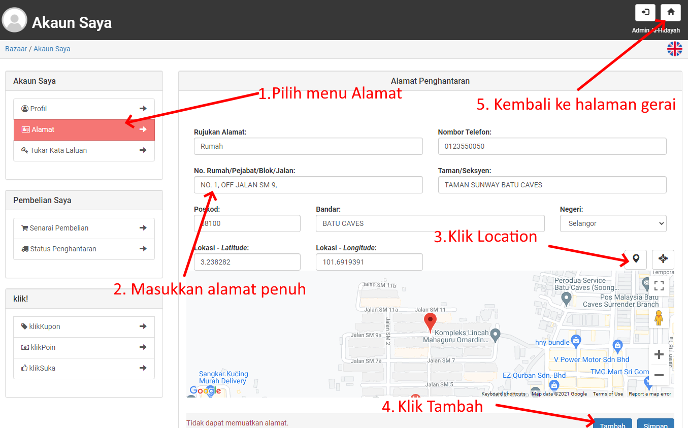 Pilih menu Alamat di sebelah kiri halaman Akaun Saya. Masukkan alamat penuh anda dengan tepat kemudian klik pada ikon GPS untuk klikBazaar mendapatkan kordinat lokasi (penting untuk pengiraan caj penghantaran dan penghantar dapat mencari dengan mudah menggunakan aplikasi Google Maps/Waze). Kemudian klik Tambah untuk menambahkan alamat anda. Jika anda ingin menukar alamat, anda boleh klik dari senarai rujukan alamat anda dan klik Simpan untuk menyimpan. Anda boleh menambah beberapa alamat seperti Pejabat, Rumah dan lain-lain. Isikan maklumat alamat anda dan klik Tambah.