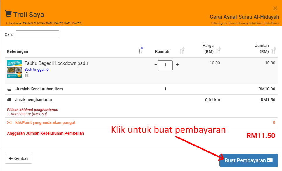 Jika anda telah log masuk ke klikBazaar, butang pembayaran akan dipaparkan di bawah troli anda. Klik Buat Pembayaran untuk meneruskan dengan pembelian anda.
