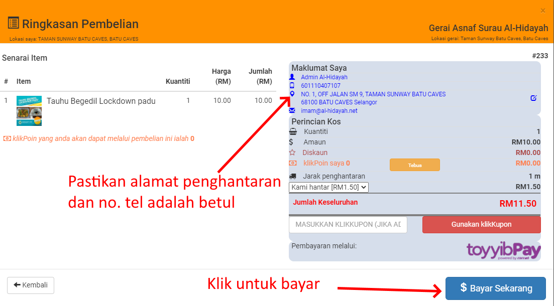 Semak semua maklmat tentang anda adalah tepat terutamanya alamat penghantaran. Jika alamat tersebut bukan alamat yang anda mahukan, klik pada ikon tukar alamat di sebelah kanan ruangan alamat tersebut dan pilih dari senarai alamat anda. Apabila semua maklumat adalah tepat klik Bayar Sekarang untuk menerukan dengan proses bayaran.