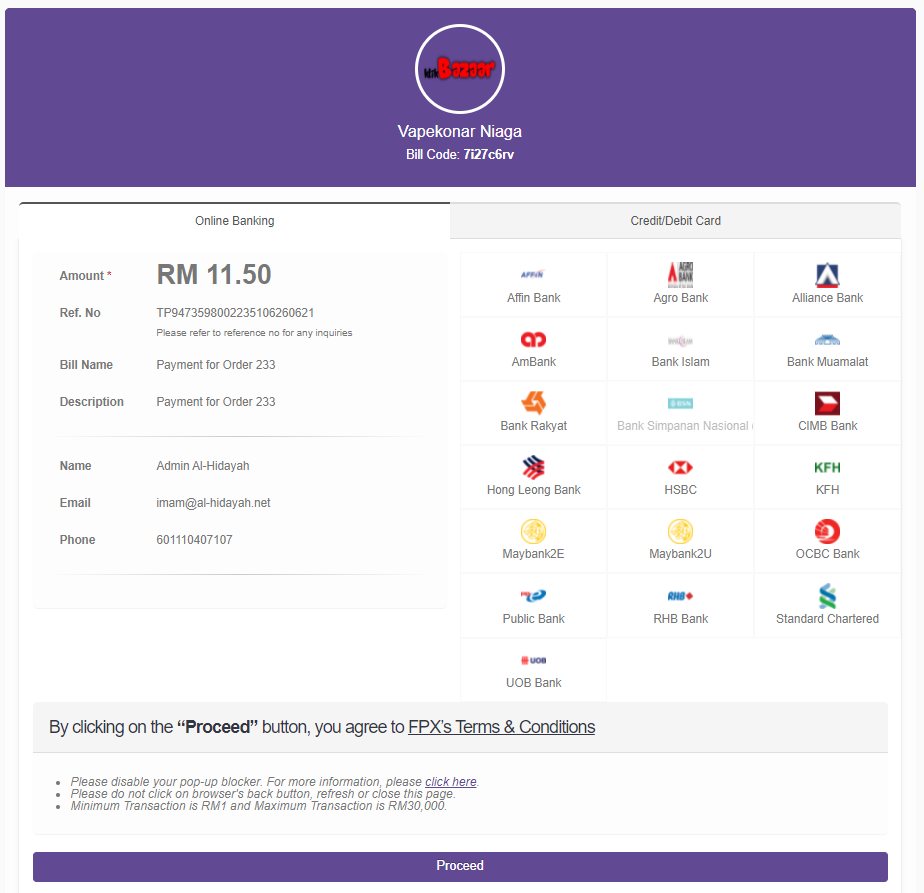 Pilih online banking anda, log masuk dan buat pembayaran pada halaman Payment Gateway dari toyyibPay. Sekiranya anda tidak dapat masuk ke halaman proses bayaran ini, sila pastikan anda membenarkan pop-up untuk website klikbazaar.biz