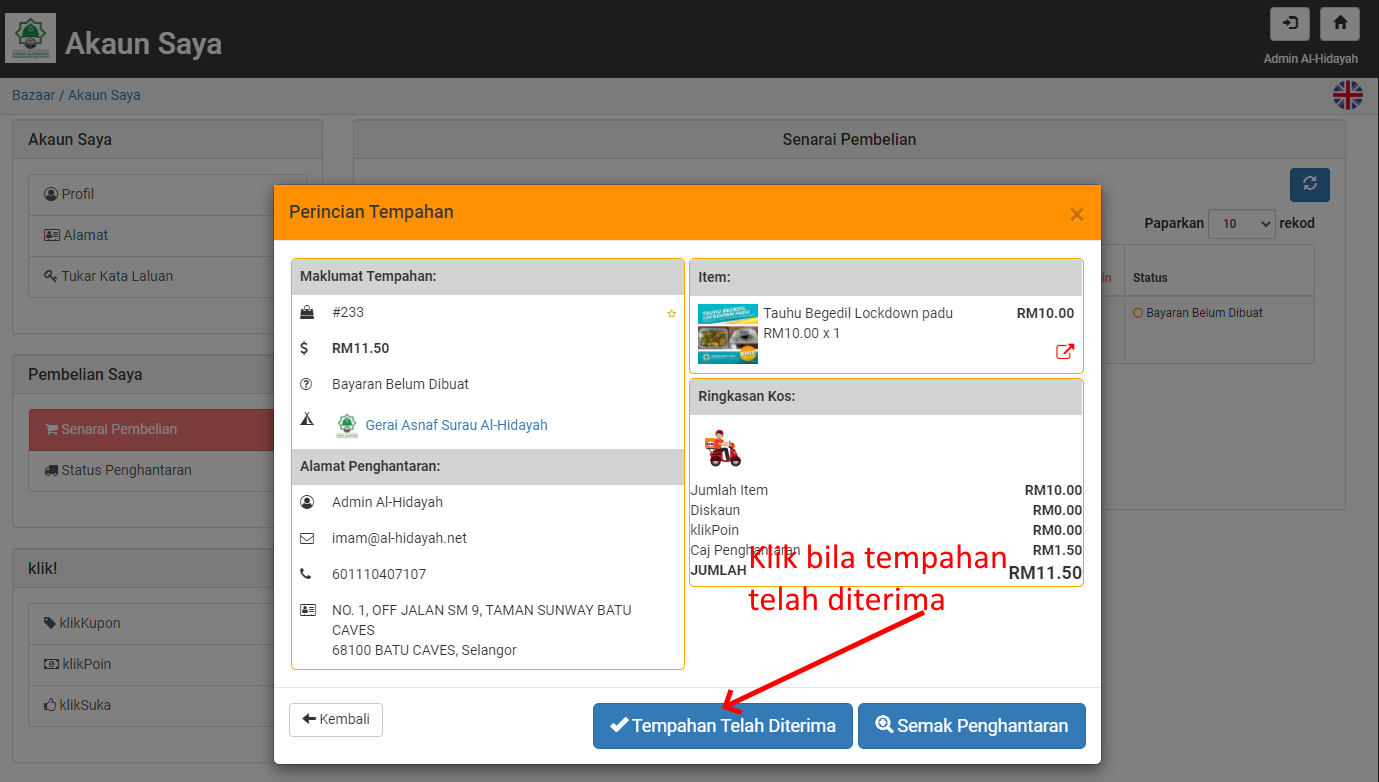 Dari sini anda boleh membuat semakan status penghantaran. Apabila anda telah menerima tempahan anda, anda boleh klik pada Tempahan Telah Diterima dan kemudian memberikan penilaian terhadap tempahan tersebut.