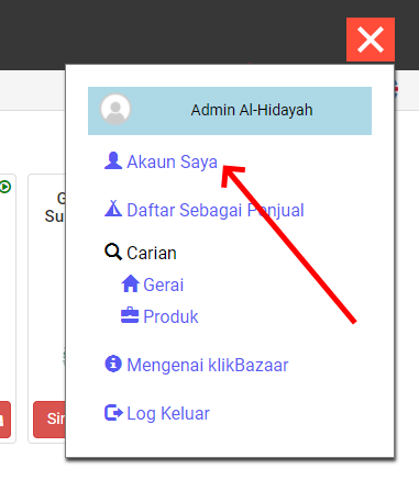 Klik menu utama di sebelah atas kanan halaman gerai-gerai untuk ke halaman Akaun Saya