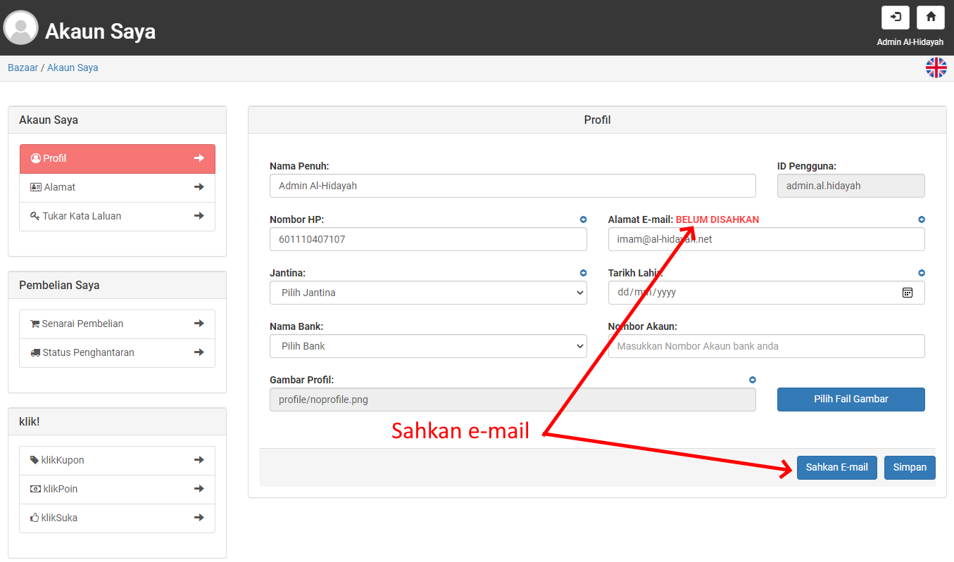 Untuk pendaftaran baru, anda perlu mengesahkan email anda untuk membolehkan anda membuat pembelian. Pengesahan email adalah penting untuk semua komunikasi dari klikBazaar.