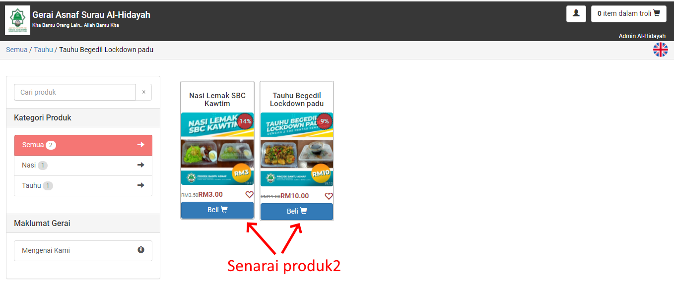 Semua senarai produk-produk yang dijual oleh Asnaf akan dipaparkan. Anda boleh klik pada menu Kategori Produk untuk melihat senarai produk pada kategori tersebut apabila produk-produk telah mulai banyak.