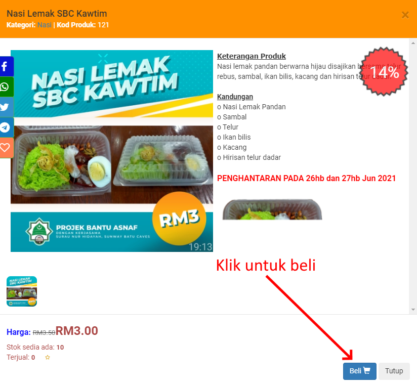 Klik pada produk yang anda ingin beli dari senarai yang dipaparkan. Keterangan produk akan dipaparkan. Klik Beli di bahagian bawah halaman produk tersebut.