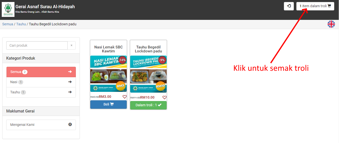 Klik pada ikon troli pada penjuru kanan atas halaman gerai untuk menyemak semua produk yang anda telah pilih.