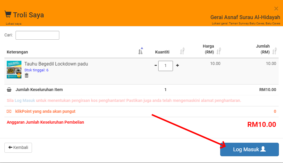 Jika anda belum log masuk ke klikBazaar, klik Log Masuk. Pembelian akan dibenarkan setelah anda Log Masuk ke klikBazaar.
