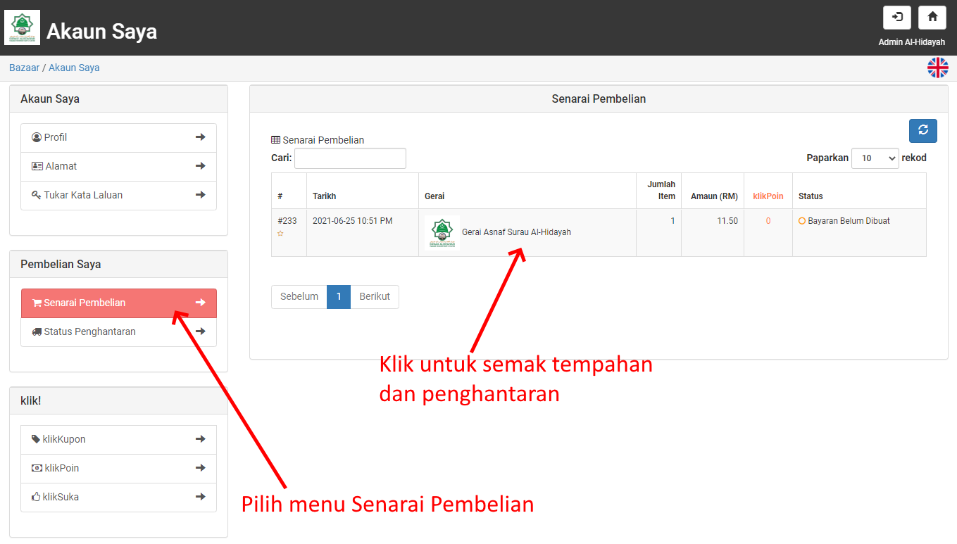 Setelah proses pembayaran selesai, anda boleh klik pada pautan Akaun Saya untuk melihat status tempahan anda. Atau klik pada ikon profile di penjuru kanan atas pada halaman gerai kemudian pilih menu Senarai Pembelian.